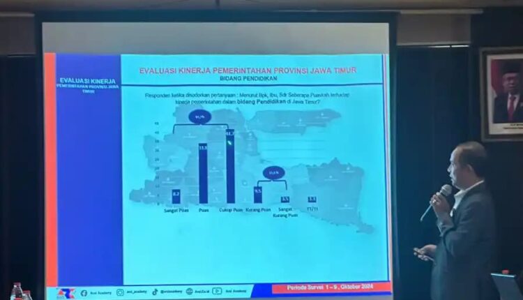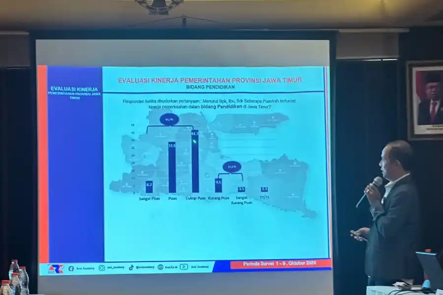 “Angka kepuasan tertinggi untuk Pemprov Jatim berada di sektor pendidikan,” kata Baihaki saat paparan di Hotel Elmi Surabaya, Senin (14/10/2024).