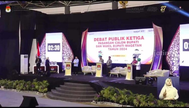 Magetan (beritajatim.com) – Komisi Pemilihan Umum (KPU) menggelar debat ketiga pasangan calon (Paslon) Bupati dan Wakil Bupati Magetan di Gedung Olahraga (GOR) Ki Mageti, Kamis (14/11/2024).