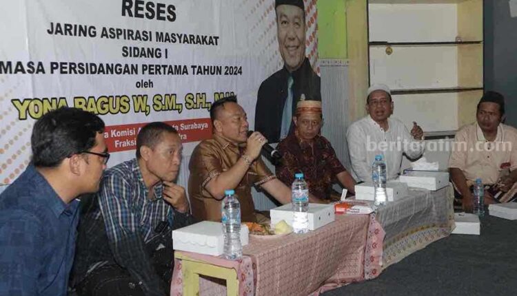 Surabaya (beritajatim.com) – Ketua Komisi A DPRD Surabaya, Yona Bagus Widyatmoko, menggelar reses jaring aspirasi masyarakat masa persidangan pertama tahun 2024 di Kelurahan Dukuh Babat Jerawat, khususnya RT 01, 02, 03, dan 04 RW 01.