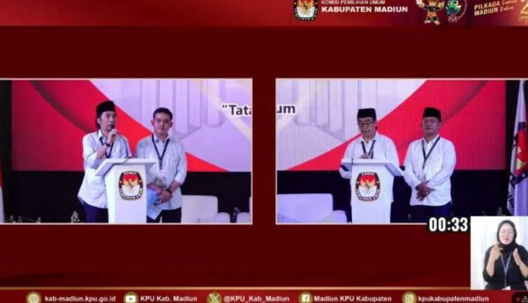 Madiun (beritajatim.com) – Komisi Pemilihan Umum (KPU) Kabupaten Madiun menggelar debat perdana pemilihan bupati (Pilbup) dengan tema utama Tata Kelola Pemerintahan, Penegakan Hukum, dan Pemberdayaan Desa di RM Icha Orient Tarsan pada Selasa (22/10/2024).