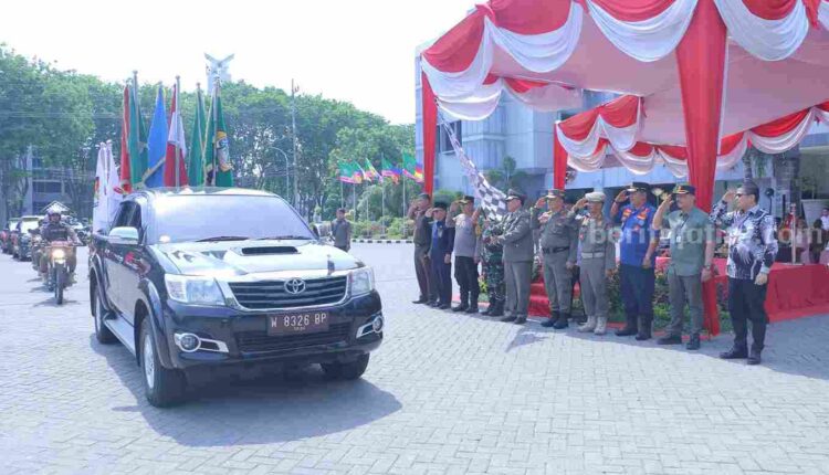 Gresik (beritajatim.com) – Puluhan personel dari TNI, Polri, Satpol PP, dan Damkar Kabupaten Gresik mengawal prosesi kirab pataka ‘Jer Basuki Mawa Beya’ dalam rangka memperingati HUT Provinsi Jawa Timur yang ke-79. Kirab pataka tersebut diberangkatkan dari Lamongan dan melanjutkan perjalanannya secara estafet menuju Kota Surabaya.