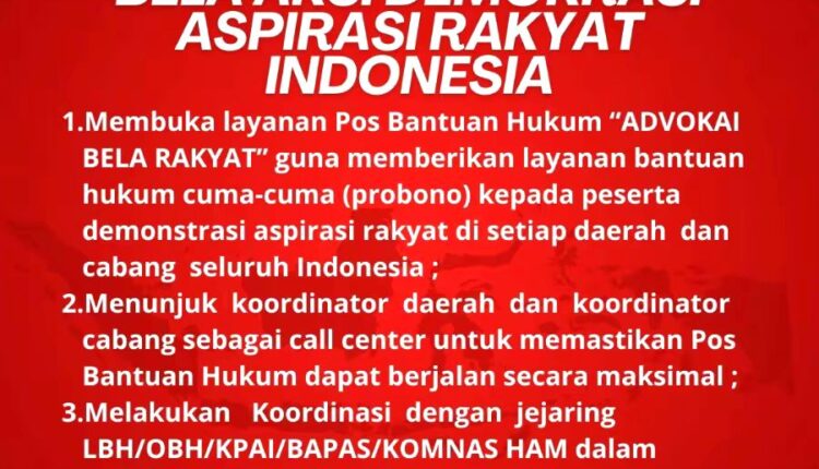 Kegiatan yang mengusung keadilan pada hak hak hukum seluruh masyarakat indonesia yang terlibat langsung dalam demonstrasi tersebut merupakan wujud tindakan para Advokat pada organisasi Kongres Advokat Indonesia yang bertanggung jawab mengawal hak hak hukum oknum masyarakat yang diduga menjadi tersangka tersebut dapat terpenuhi sesuai KUHAP dan Undang Undang yang berlaku,