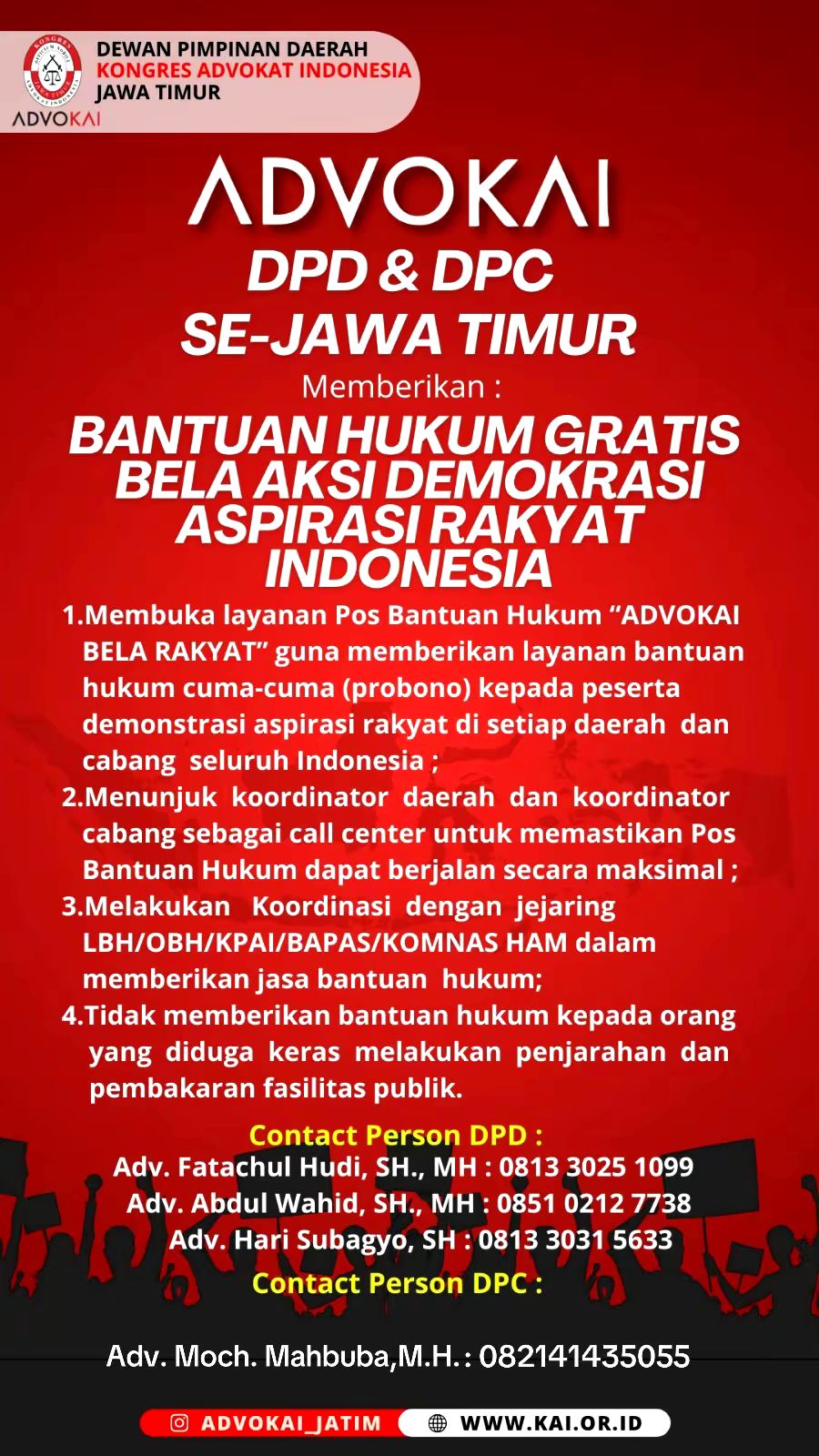 ADV. Moch Mahbuba.,SH., MH. sebagai presidium DPC ADVOKAI Kediri menyampaikan ” kami sebagai Advokat Officium Nobile merupakan profesi yang mulia, luhur dan terhormmat serta menjunjung tinggi tegak dan adilnya Hukum di Indonesia, siap memberikan pendampingan Hukum secara gratis terhadap para terduga pelaku yang telah diamankan oleh pihak kepolisian kususnya kepada terduga pelaku yang masih pelajar / dibawah umur“. terangnya
