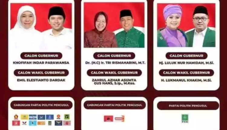 Tiga pasangan yang akan bertarung dalam Pilkada Jatim 2024 adalah Luluk Nur Hamidah-Lukmanul Khakim (Nomor Urut 1), Khofifah Indar Parawansa-Emil Elestianto Dardak (Nomor Urut 2), dan Tri Rismaharini-KH Zahrul Azhar Asumta (Nomor Urut 3).
